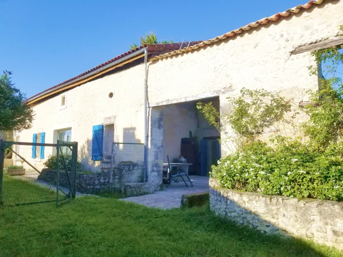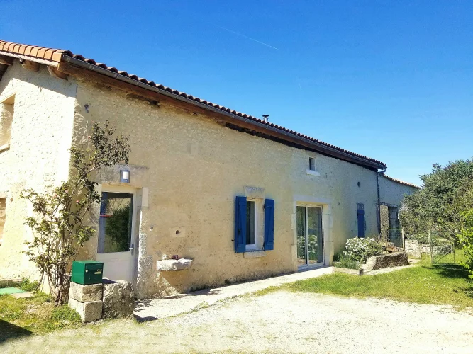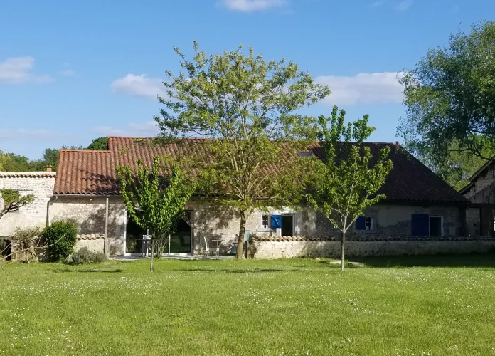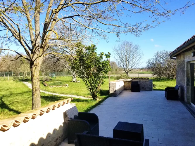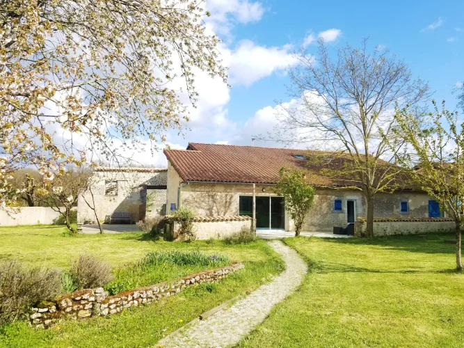 Grande maison charentaise en pierre, entièrement rénovée, avec un beau jardin clos et arboré, et une belle vue dégagée sur la campagne.