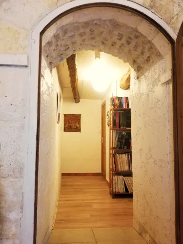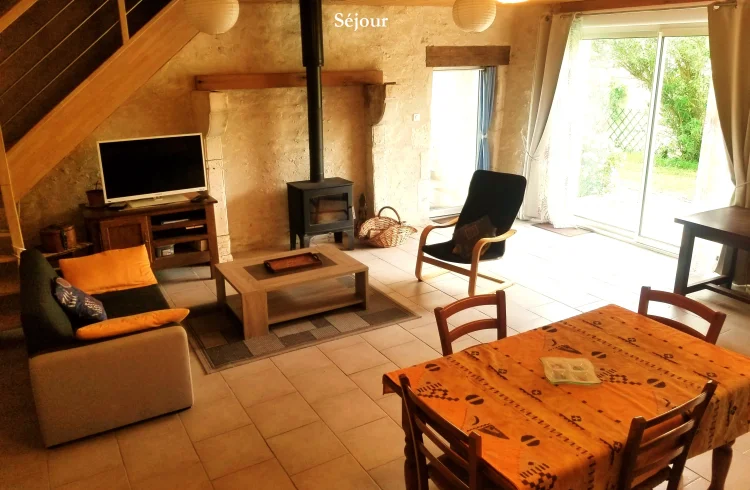 - une grande salle de séjour de 43 m² avec des murs en pierres apparentes et un poêle à bois (2021).