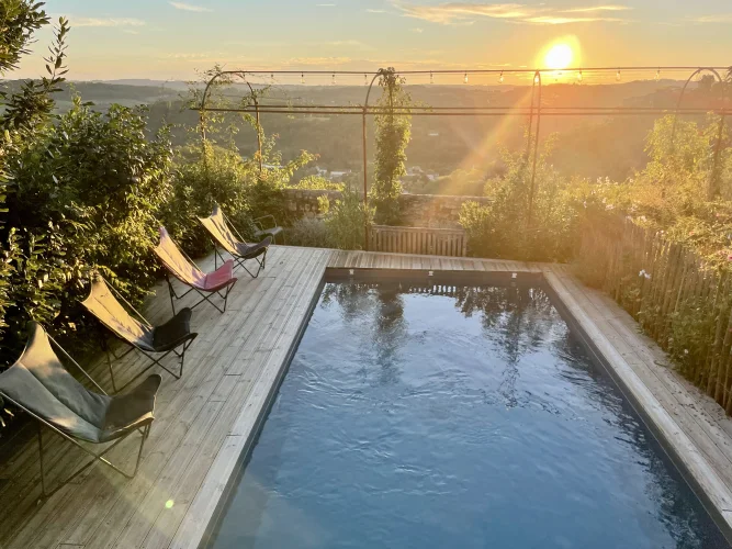 Depuis ses jardins en terrasses surélevés, la propriété bénéficie d'une vue panoramique imprenable sur la vallée de la Dordogne, offrant un havre de paix et une beauté intemporelle, tout en restant à quelques pas des commerces et services du village.