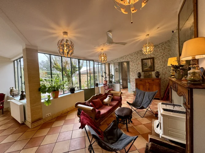 - Un salon d'été lumineux, vitré et ouvert sur le jardin
