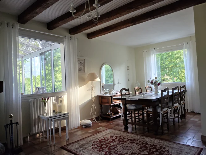 En excellent état, entièrement carrelée. Double vitrage, volets roulants, chauffage central au fioul, grande véranda de 27 m². Séjour avec cheminée et poêle à bois (43 m²), cuisine entièrement équipée (11 m²), bureau avec étagères et bureau intégré (6,75 m²). 3 chambres : 2 de 11 m² et 1 de 12 m², salle de douche communicante entre 2 chambres. Salle de bains avec double vasque, baignoire, WC et bidet (6,50 m²), WC séparés avec lavabo, couloir avec placards intégrés et escalier menant au sous-sol de 115 m², comprenant : buanderie avec évier, chaudière, placard intégré et emplacement pour lave-linge ; atelier ; débarras avec évier et étagères ; grand parking pour 3 voitures.