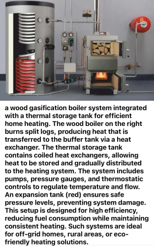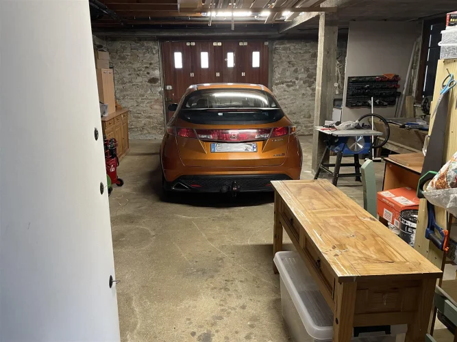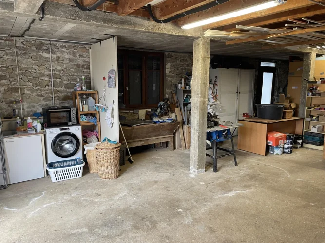 Grand garage (70 m²) avec système de chauffage écologique neuf, comprenant un ballon d'eau chaude sanitaire de 1500 litres (chauffage des radiateurs et production d'eau chaude sanitaire). Ce système est alimenté par une chaudière à gazéification de bois (Bayer HVS-E Chaudière à bois 25 kW EN303-5) et 3 panneaux solaires (8 m²). Ce système est très économique en hiver et permet de produire de l'eau chaude gratuitement par temps ensoleillé grâce aux panneaux solaires. Buanderie avec évier et lave-linge.