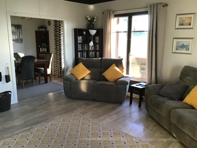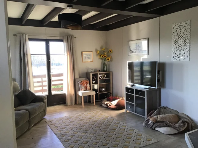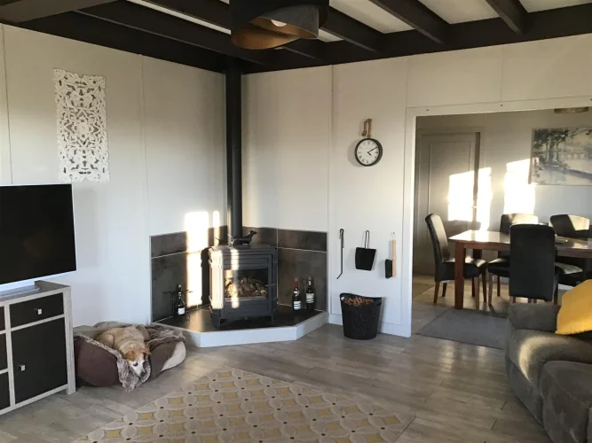 Salon (23 m²) : pièce lumineuse avec deux portes-fenêtres donnant sur un balcon et un poêle à bois neuf.