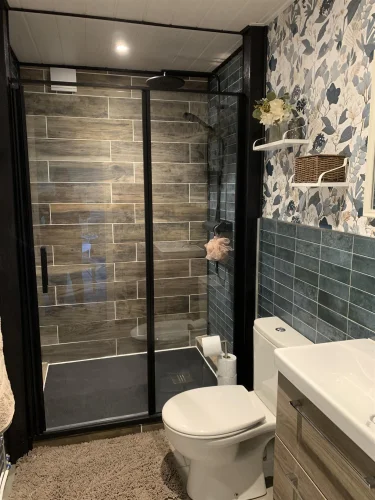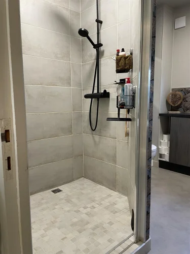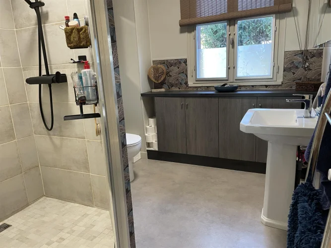 Salle de bains (7 m²) avec rangements intégrés, grande douche à l'italienne, lavabo, toilettes et hotte aspirante.