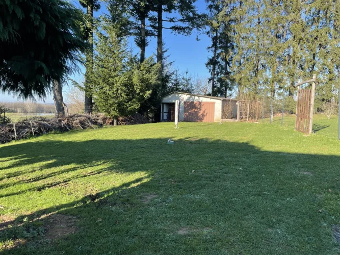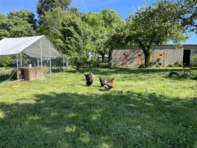 Dépendances : un troisième garage/abri de 30 m², un hangar ouvert, des poulaillers avec un grand enclos clos, un abri pour animaux et une écurie.