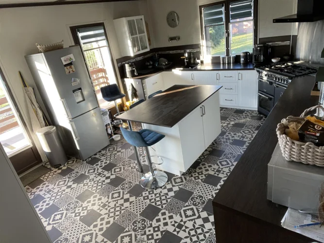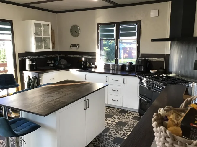 Cuisine (21 m²) avec accès à un balcon. Elle est équipée d'une nouvelle cuisinière Stoves avec hotte aspirante, d'un réfrigérateur-congélateur et d'un îlot central avec plan de travail en Dekton. Nombreux rangements intégrés et grand plan de travail, avec hotte aspirante.