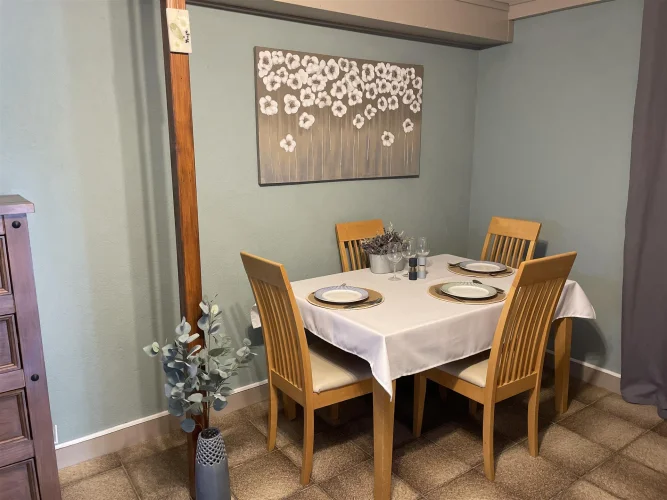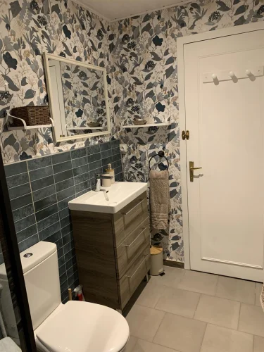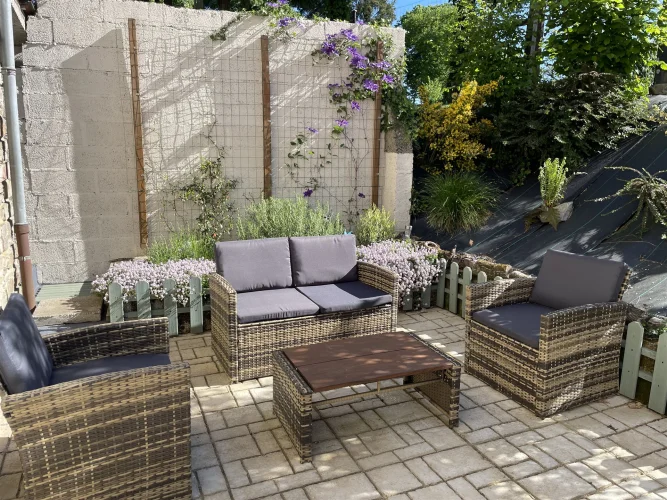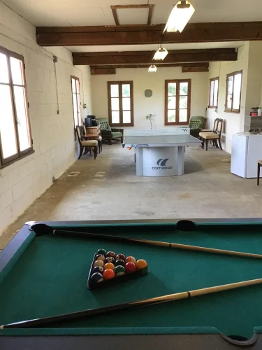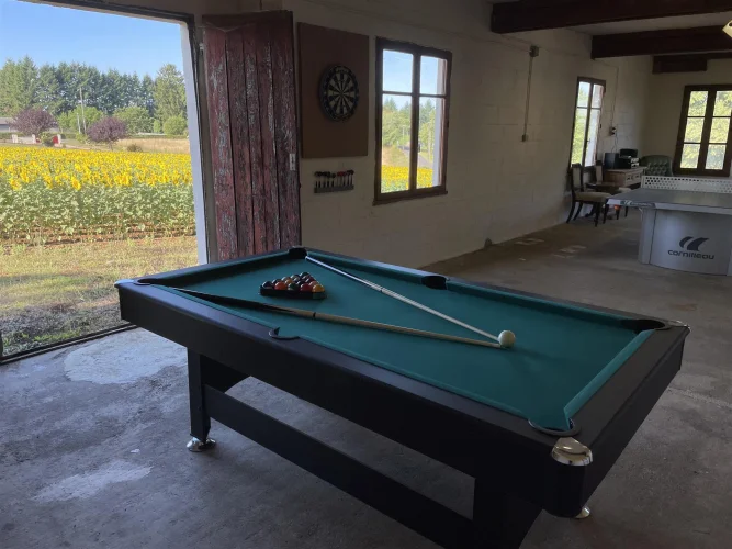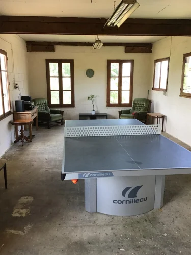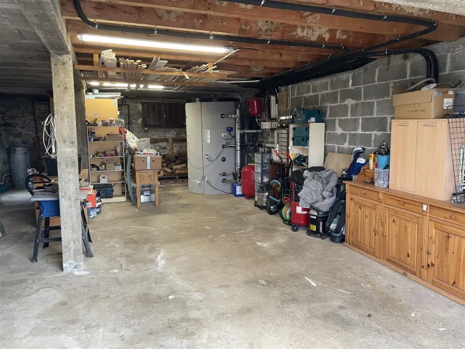 Garage au rez-de-chaussée – actuellement utilisé comme bûcher. Au-dessus se trouve une grande pièce (environ 70 m²) qui pourrait être transformée en studio ou en salle de sport - actuellement utilisée comme salle de jeux avec des sièges, une table de ping-pong extérieure, une table de billard et des fléchettes - tout cela pourrait être laissé en place.
