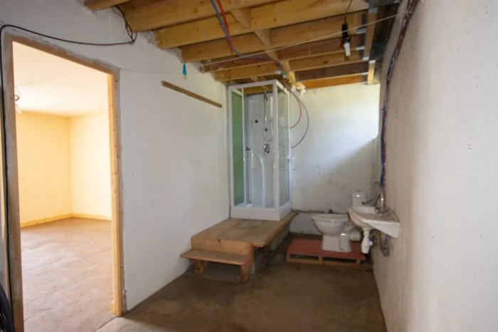 A gauche se trouve une chambre et une salle de douche ouverte avec w.c.
